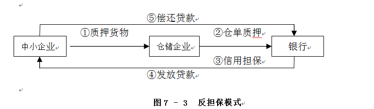 對于某些以寄存在倉儲企業(yè)倉庫中的貨物向銀行申請倉單融資仍有困難的中小企業(yè),可以通過反擔保模式得到貸款。該模式需要大型倉儲企業(yè)構建中小企業(yè)信用擔保體系,倉儲企業(yè)以中小企業(yè)寄存的貨物作為反擔保抵押物,通過擔保實現(xiàn)貸款;或者倉儲企業(yè)直接為中小企業(yè)申請倉單質押貸款提供擔保,間接地提供中小企業(yè)信用。具體操作流程如圖7-3所示。